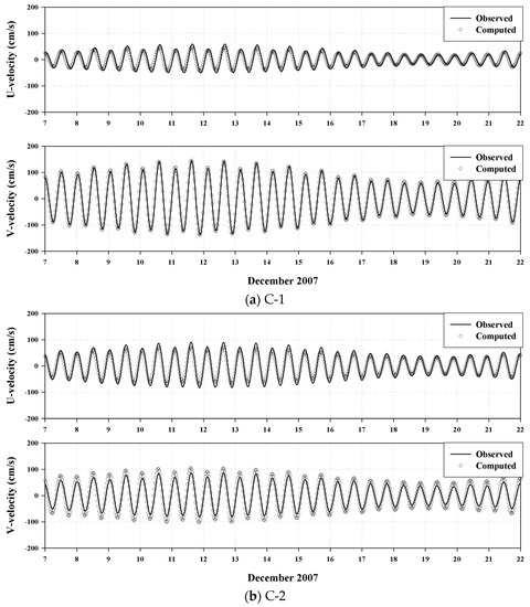 Comparison between observed and computed tidal current time series at (a) C-1 and (b) C-2.