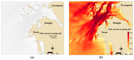 Ebb current at spring tide in the bottom layer: (a) temporal current velocity vector and (b) contour plot.