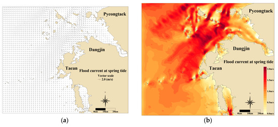 Flood current at spring tide in the bottom layer: (a) temporal current velocity vector and (b) contour plot.