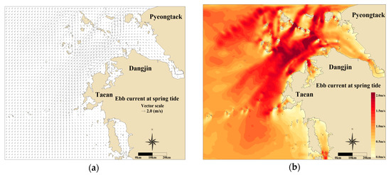 Ebb current at spring tide in the surface layer: (a) temporal current velocity vector and (b) contour plot.