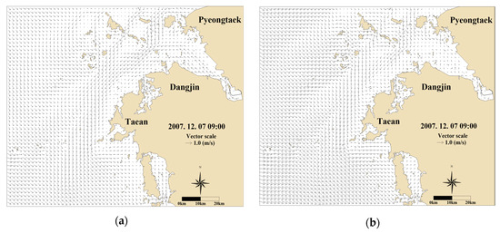 Figure 14 shows a snapshot of the tidal currents at 9 a.m., on 1 December 2007, when the wind speeds were the highest after the oil accident. Considering both the tidal and wind drift currents, Case 2 illustrates a good flow to Sinduri Beach.