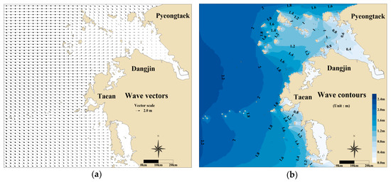 As shown in Case 3, in Figure 2, a wave numerical experiment was performed to consider the Stokes mean drift caused by the external force in the oil spill numerical experiment. The Korea Coast Guard (KCG) report [2] suggested that the oil arrived at Sinduri Beach 13 h after the oil spill. As shown in Figure 6, the weather during this period was severe, with a wave height of 1.0–3.0 m. To observe the effect of Stokes mean drift in this scenario, the wave heights and periods observed in the Gadaeam buoy were averaged from 7 a.m. to 8 p.m., on 7 December 2007. The averaged observation data at Gadaeam buoy are a wave height of 2.0 m and a period of 3.5 s. Next, the simulation of wave deformation caused by the SWAN model was repeated through trial and error, until the numerical results were consistent with the average observation data (H = 2.0 m, T = 3.5 s) at the Gadaeam buoy. The calculated wavefield data were then applied to the Stokes mean drift. The Stokes mean drift was calculated from the following equation proposed by Stokes [28]: