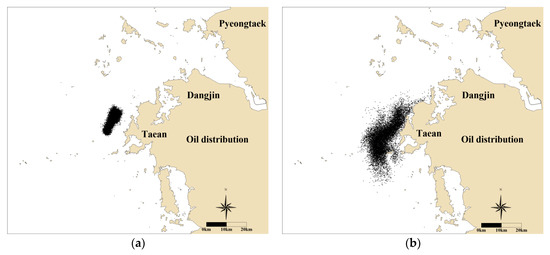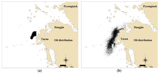 Figure 17 shows the result of the oil spill diffusion simulation considering tidal currents and wind drift currents. The result at 8 p.m., on 7 December 2007, shows a similar diffusion trend to the case considering only tidal currents, such as spreading out to the northeast–southwest direction because of the typical reversing tidal currents. However, in this case, it is observed that some spilled oil approaches the Manripo and Sinduri beach, owing to the wind drift current. According to the results at 11 a.m., on 11 December 2007, the spilled oil continued to diffuse in the northeast–southwest direction because of the reversing tidal currents, and the spilled oil reached the beach owing to the wind drift current. Moreover, the diffusion distance between the south and north seemed to almost match with the diffusion distribution of the satellite image. Thus, based on these results, it was determined that the wind drift currents contributed to oil attachment to the coast.