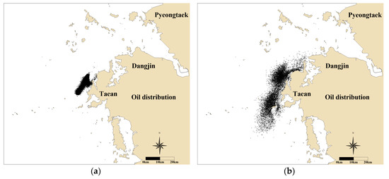 Oil distribution considering tidal current conditions: at 8 p.m., on 7 December 2007, (a) 13 h after the accident; (b) at 11 a.m., on 11 December 2007.