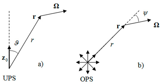 We also assume that the UPS with the power is located at the point in water and acts in the direction of the unit vector (see Figure 1a). The light radiance at the point in the direction of the unit vector at the time is denoted by . The problem is to obtain formulas for calculating the scalar irradiance