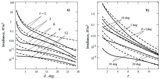 Irradiance from unidirectional point source (UPS) depending on the polar angle (a) and optical distance (b), calculated according to new formulas (solid curves) and to Equation (64) (dotted curves); the numbers in (a,b) indicate the values of and , respectively; source power 1 W, c = 0.4 m−1.