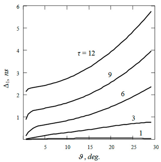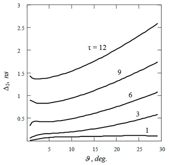 The delay of the “center of gravity” of the pulse (in nanoseconds) because of the scattering of light in water depending on the angle at various optical distances (indicated by the numbers in the figure); c = 0.4 m−1.
