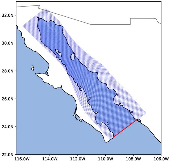 The model domain is the marine region between the Colorado River Delta, located around (32 N 115 W), and the southern boundary of the grid shown in Figure 1, which extends from around (2430′ N 10750′ W) to (2304′ N 10935′ W). This domain may be divided in the Upper Gulf of California, the Great Island (or Midriff) Region, and the Southern Gulf of California []. Taking into account these regions, the Gulf of California is 1100 km long and around 150–200 km wide. The Upper Gulf of California is the very shallow (depth < 30 m) region north of 31 N. the Great Island Region consists of a group of islands separated by narrow channels and sills with maximum depths of 300–600 m. In the Southern Gulf of California, the continental shelf is very narrow, and water depth of the channels and basins can be up to 3000 m. Stratification in the Gulf of California plays a role in the overall dynamics of the Gulf. In the mouth of the Gulf, the mixed layer depth can vary from 10–40 m. In the northern Gulf the mixed layer can vary between 100 m in the Delfin basin and 50 m in the Wagner basin, for example Reference []. The energetically dominant signal, however, is barotropic, in particular in the upper Gulf.