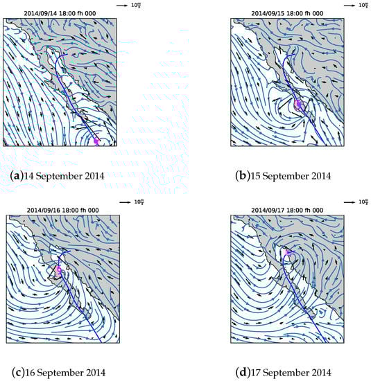 The wind and surface pressure data was taken from the North American Mesoscale model (NAM) with 12 km resolution. Hourly forecasts from the four daily forecast runs at UTC 00:00, 6:00, 12:00, and 18:00 were used, except for the 13 September and UTC 07:00–11:00 19 August, where the NAM data is not available. This gap was filled with data from the North American Regional Reanalysis (NARR) at three hourly temporal resolution. Representative wind fields for four dates are shown in Figure 2. Also shown is the trajectory of hurricane Odile and its current location. The reversal of the wind direction, when compared to the climatology—presented next—can be observed. The wind speeds are also significantly higher, as expected.