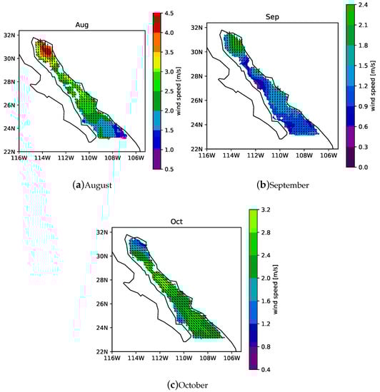 The climatology of the Gulf is strongly seasonal. Focusing on the Monsoon period (July to September), Reference [] generated a climatology for the Gulf of California using five years of QuickSCAT winds. Their climatology resolves the influence of the peninsula of Baja California and the dominant wind field patterns, together with the strong seasonal signal in the winds over the Gulf of California, which have also been identified in previous studies [,]. In the meantime, the availability of data sources has improved, and data from high–resolution weather models, reanalysis, and remote sensing is now available.