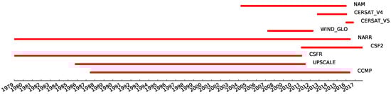 The wind climatology data sources and their temporal coverage are shown in Figure 4. The data sources comprise five model datasets, UPSCALE, CSFR, CSF2, NARR and NAM, and four satellite products: CCMP, WIND-GLO, CERSATV4 and CERSATV5. These data sources are introduced in the following.
