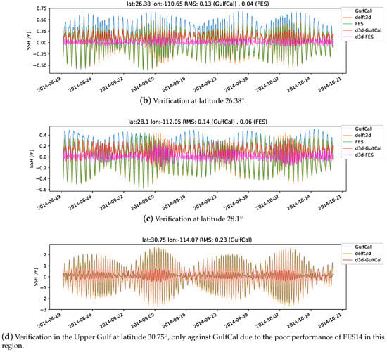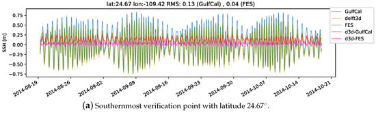No observational data could be obtained for the simulation period. Therefore, the model prediction of sea surface height was verified using AVISO (Archiving, Validation and Interpretation of Satellite Oceanographic data, a service provided by the French National Centre for Space Studies (CNES)) Satellite Altimetry combined with a tidal barotropic model, and GulfCal []. The currents were verified against TPXO8. The obtained comparisons, errors and correlations are presented next.