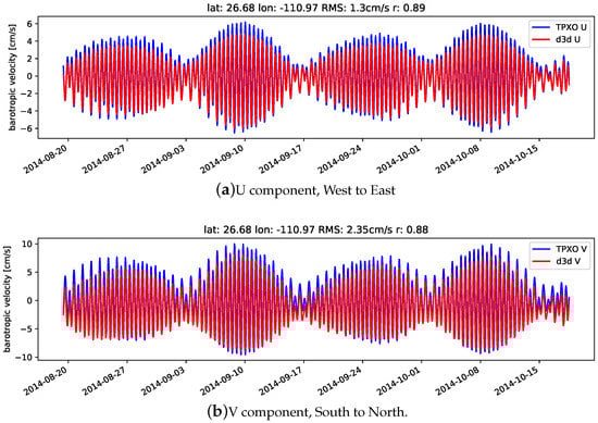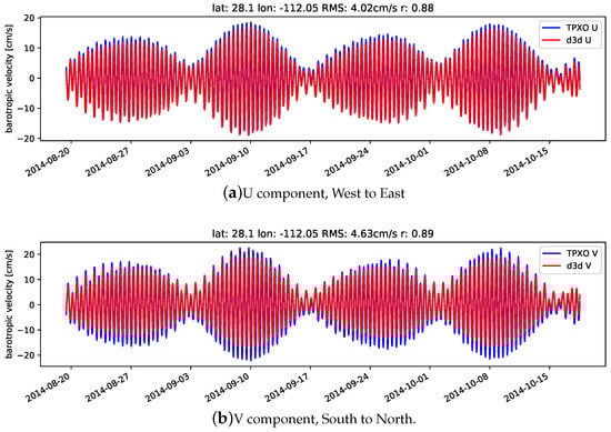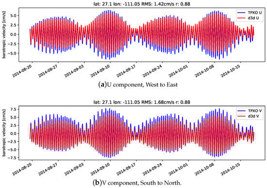 Time-series of components of the barotropic current at latitude 27.1 N, longitude—111.05 E. The delf3D (d3d) components have been depth-averaged for comparison. All dates in UTC.