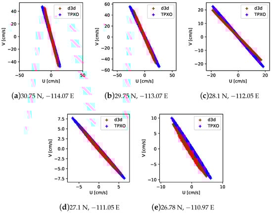 Here, Delft3d is run as a barotropic model. Therefore, the currents have to be compared to the barotropic component of the observed currents. These have been obtained from the TPXO 8 atlas version 1 [], using local solution SoC. All available constituents have been included, namely: m2, s2, n2, k2, k1, o1, p1, q1, m4, ms4, mn4, mm, and mf. The Delft3d solution has been depth-averaged for comparison with the TPXO currents, assuming piece-wise constant profiles over the sigma layers. West to East (U), and South to North (V) component time-series are compared in Figure 6, Figure 7, Figure 8, Figure 9 and Figure 10 for five points distributed along the Gulf, North to South. The tidal ellipses have been constructed from a scatter plot of the components and are shown in Figure 11 for the same five points.