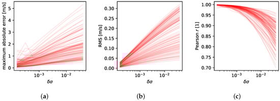 The velocity field of the surface (or first) sigma layer of run 10, that is, the experiment with was used as the reference value, or true value, and is denoted in the following. With this reference value, a numerical convergence study was performed to demonstrate satisfactory convergence of the model result. Figure 12, shows a convergence of the Pearson r and RMS error below ms for , which is acceptable.