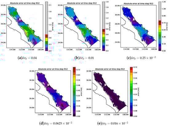 Maps of absolute error, , with n denoting the vertical layer thickness in the surface layer at plot time step 912, 38 days after simulation start, 2014-09-16T00:00 UTC.