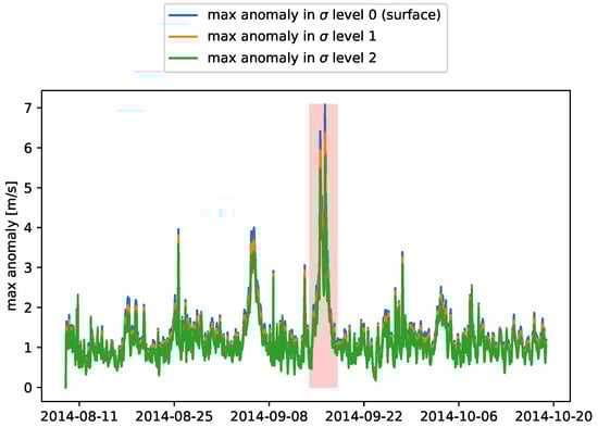 Maximum surface current anomaly time series for the three topmost model layers. All dates in UTC.