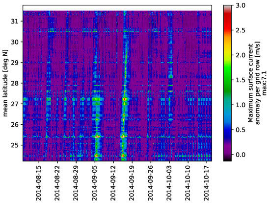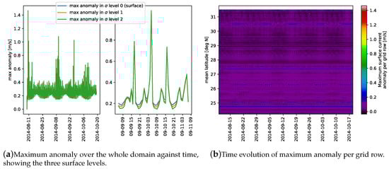 The maximum surface current speed anomaly reaches 6 m/s. Figure 14 shows the time series of the maximum anomaly over the whole domain. The temporal evolution per grid row (West to East) is shown in Figure 15.
