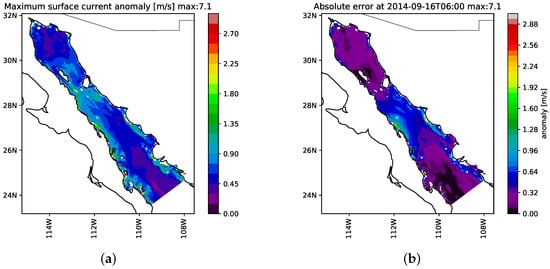 Current anomalies due to Odile. All times in UTC. (a) Map of maximum anomaly during simulation period for each grid point. (b) Map of the anomaly at the time of the maximum anomaly in the time series (c.f. Figure 14).
