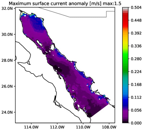 In that Figure, it can be seen that the 6 m/s values are isolated peaks, and for the largest part, the anomaly is between one and two meters per second. Plotting the maximum anomaly per grid point on a map of the Gulf, shown in Figure 16, shows that the most considerable impacts of the hurricane on the current speeds occur at the coast or close to islands. Due to techno-economic constraints, tidal energy converters (TECs) would also be installed near the coast (in shallow water) or close to islands, at least at the early stages of development []. Therefore, the probability of TEC damage due to the passage of the hurricane is great.