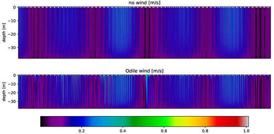 The wind forcing is a surface-driven process. If the vertical resolution is not sufficient, then the velocities will not be accurately captured, that is, the mean across the sigma level is very different to the velocity at the top and bottom boundaries of the respective sigma level. The risk here is that only their mean effect on the top layer is resolved. In order to avoid this, the vertical resolution of the model was increased continuously until the surface velocities converged. First, a model with a grid of 25 layers with a uniform vertical resolution, resulting in a constant dimensionless layer thickness of 0.04, was run. Then, the first layer, with a thickness of 0.04, was replaced by two layers with a thickness of 0.02. Then, the top layer of 0.02 was replaced by two layers with thickness 0.01, down to the highest possible vertical resolution allowed by the model, corresponding to a layer with a thickness of . This procedure yielded ten different vertical discretizations, listed in Table 2. Note that the last column of that table does not follow this scheme precisely due to the minimum thickness of allowed by the model.