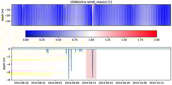 Safe depth at lat = 28.260 N lon = −111.772 W. Safe depth is here defined as the depth where the velocity never exceeds , the maximum velocity in the no-wind simulation, during the period starting at day five and finishing at the end of the simulation. The red rectangle indicates the period of Odile. The top two panels show the velocity profiles without and with Odile winds. The third panel from the top shows the velocity profile with Odile winds, normalised by the maximum velocity observed for the no wind case at the respective depth, therefore, showing a representation of safe depth before the restriction to a certain assumed safe current. The bottom panel shows the iso-line of the assumed safe current of 115%, as per the definition of the safe depth. All dates in UTC.
