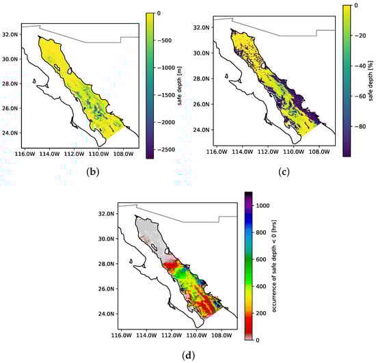 Safe depth analysis over the course of Hurricane Odile. (a) Safe depth in meters. (b) Percent of total depth, indicating locations where the anomaly extends through the whole water column. (c) Accumulated hours of occurrence of safe depth < 0, that is, duration of potential exposure of devices.