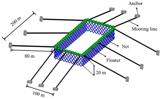 A floating rope enclosure with a twelve-point mooring system was used for the investigation of the hydrodynamic characteristics (Figure 6). The floating rope enclosure mainly consists of floaters, nets, mooring lines and sinkers. Floaters as a buoyancy system are mounted on the top of the net; sinkers as a weight system are connected to the bottom of the net.