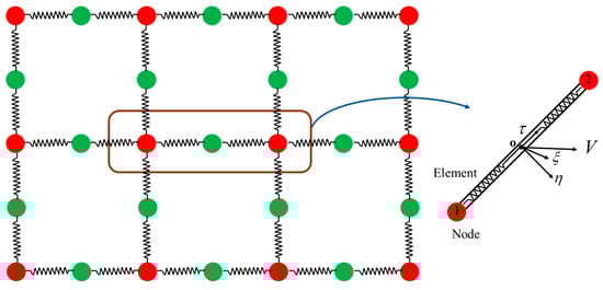 In order to calculate the force acting on the net, the lumped mass method is adopted to establish the numerical model. By means of the lumped mass method, the net is divided into many mass points which are interconnected by massless springs (Figure 3). The mass point is set at every corner and the center of the mesh bar. There are more than 22800 mass points for net which makes the calculation difficult, so the mesh grouping method [26] was adopted to reduce the computational difficulty. Equivalent meshes are applied to modeling the actual meshes. Equivalent meshes have the same projected area of the netting, specific mass and the weight as the actual meshes. The net used in experiment is 300 ×15 diamond meshes with a mesh size of 20 mm and a diameter 1 mm. The equivalent meshes in the numerical simulation have a mesh size of 100 mm and a diameter 5 mm.