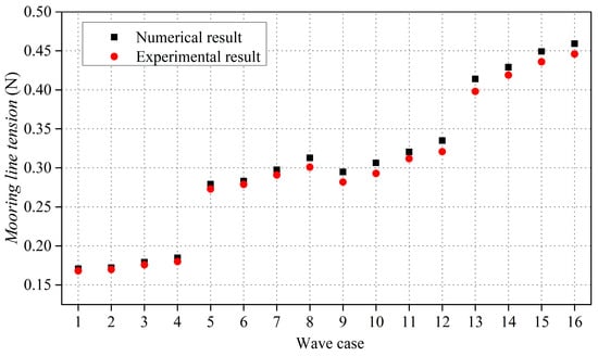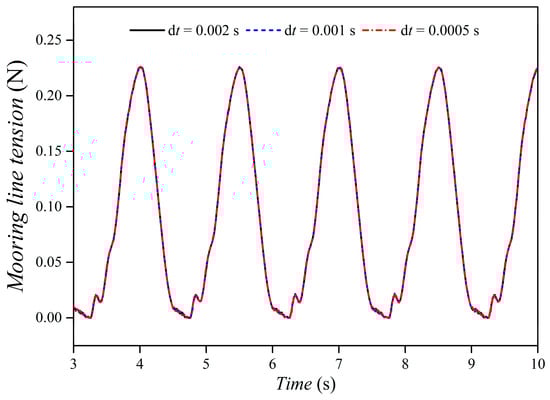 This section provides the comparative analysis of experimental results and numerical results to verify the reliability of the numerical model. The convergence test is first carried out with respect to different time steps using dt = 0.002 s, 0.001 s and 0.0005 s, as shown in Figure 7. It is seen that the numerical results are almost identical and thus, dt = 0.001 s is chosen for each of the following cases. In the numerical simulation, the pre-tension of every mooring line is also 0.03 N, corresponding to the experimental value. The comparison object is the maximum mooring line tension and the maximum horizontal and vertical movements of the tracking point. The comparison of maximum mooring line tension between numerical simulations and experiment results is shown in Figure 8. The comparison of maximum horizontal and vertical movement amplitude of tracking points between the numerical results and the experimental results are shown in Figure 9 and Figure 10, respectively.