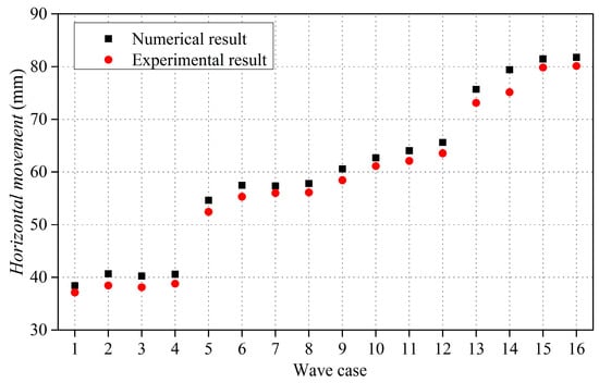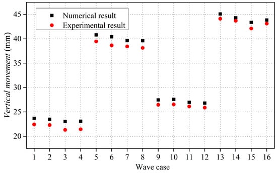 By analyzing the data in Figure 8, the maximum relative error and mean error between the experimental and numerical results of maximum mooring line tension under different conditions are 4.6% and 3.0%, respectively. The largest relative errors of the horizontal movement is 5.8% and the mean relative errors is 3.8%; the largest relative and mean errors of the vertical movement are 8.0% and 4.3%, respectively. The relative errors between the numerical and experimental results on the mooring line tension and motion response are in the range of approximately ±10%. There is good agreement between the experimental results and the numerical simulation. Therefore, the established numerical model is suitable for calculating the hydrodynamic response of a floating rope enclosure in combined wave current.