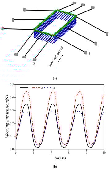 Take a twelve-point floating rope enclosure under an 8 cm wave height with a period of 1.5 s combined with current of 20 cm/s as an example to find out where the maximum mooring line tension occurs in the floating rope enclosure. Due to the large number of mooring lines for mooring system and symmetry of the structure, mooring line tension on the windward side numbered in the Figure 11a is calculated by numerical model. Figure 11b shows the time history of mooring line tension of each mooring line, the mooring line tension reaches the steady state after 5 s. Compared the maximum mooring line tension of these three mooring lines, the maximum mooring line tension of No. 2 is the biggest for 0.45 N. The maximum mooring line tension for number 1 is 0.34 N and the maximum mooring line tension of number 3 mooring line is 0.29 N. The above results show that the maximum mooring line tension of the floating rope enclosure occurs on both sides of the windward and the windward side experiences more external hydrodynamic loads. This result is consistent with the results that have been found by Xu et al. [19] and Zhao et al. [3]. They investigated the mooring loads for multiple net cages and their research also shows that the maximum mooring line tension of different configurations appears at the windward of the structure and the windward endures more loads. Based on the above analyses, it may be a better choice to reinforce the windward mooring lines to withstand the external loads.