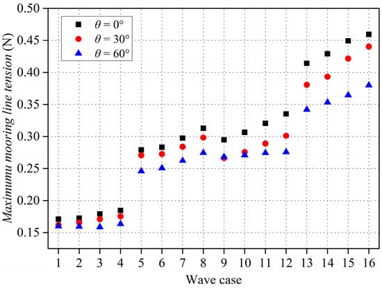 Practically at most sites, the waves are not parallel to the current. In this part, several currents and wave directions were investigated to properly represent the design site conditions. The incident wave forward along the X-axis was kept constant but the incident direction of the current was changed to investigate its influence on the maximum mooring line tension. When the wave and current are in the same direction, the angle between waves and currents is 0°. Three angles between waves and currents were set, respectively, 0°, 30° and 60°. The maximum mooring line tension of the floating rope enclosure at different angles are shown in Figure 12. With the increase of the angle between waves and currents, the maximum mooring line tension tended to decrease. When the current velocity was 0.1m /s and the wave height was 4 cm, the maximum mooring line tension under 30° and 60° decreased 4.69% and 9.17% on average compared with that under 0°; When the current velocity was 0.1 m/s and the wave height was 8 cm, the maximum mooring line tension under 30° and 60° decreased by 3.99% and 11.86% on average compared with that under 0°; when the current velocity was 0.2 m/s and the wave height was 4 cm, the maximum mooring line tension under 30° and 60° decreased to 9.93% and 13.17% on average compared with that under 0°; when the current velocity was 0.2 m/s and the wave height was 8 cm, the maximum mooring line tension under 30° and 60° decreased 6.67% and 17.8% on average compared with that under 0°. From the above analysis, when the wave and the current were in the same direction, the mooring line tension was the largest. Increasing the incident angle between waves and currents helps to reduce the maximum mooring line tension. Increasing the angle between waves and currents has a better effect on reducing the maximum mooring line tension under a higher current velocity.
