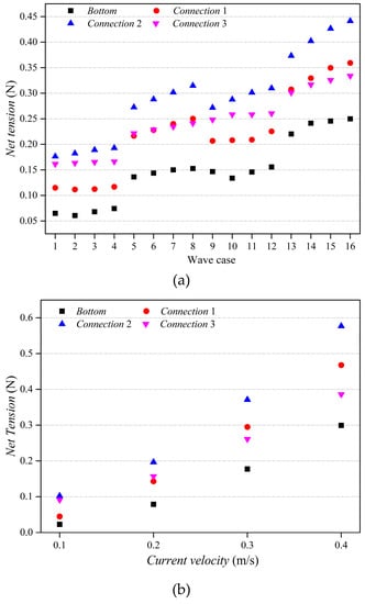 The bottom of the floating rope enclosure is important for fixing the shape of the whole structure and preventing fish from escaping. Excessive force acting on the bottom may cause the net to separate from the seabed, or the motion of the gravity system, which is harmful for the security of the whole structure. The net tension of the bottom is closely related to the design of the weight system. The connection between the net and the mooring line is at a relatively weak position because the net here bears more mooring line tension than in other positions. Therefore, it is of great importance to study the net tension in connection to ensure the safety of the whole structure. Figure 13 shows the maximum net tension in the bottom and the net tension of three connections between mooring lines and net (shown in Figure 11a). As seen from Figure 13a, the maximum net tension of the bottom under combined waves and currents is much less than that of the connection. This can be explained by the attenuation effect of waves as water depth increases. The net tension of connection 2 under combined waves and currents is the largest compared with other connections and the mooring line tension here is also the largest. However, when the wave height is 4 cm, the net tension at connection 1 is less than that of connection 3; when the wave height is 8 cm, the net tension is slightly greater than the net tension at connection 3. This difference may be due to the inconsistent orientation of the mooring lines. Figure 13b shows the maximum net tension under current only. Under the action of the current only, the net tension at connection 2 is still the largest and the net tension at the bottom is the smallest. As for connections 1 and 3, when the current velocity is 0.1 m/s and 0.2 m/s, the net tension at connection 1 is less than that at connection 3. When the current velocity is greater than 0.2 m/s, the net tension at connection 1 is greater than that at connection 3, and as the current velocity increases, the difference between them increases.