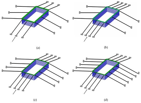 The number of mooring lines is a significant design factor that needs to be analyzed. The enclosure may have a violent deformation and give rise to damage of the structure with a small number of mooring lines. A large number of mooring lines affects the flexible characteristics of the floating rope enclosure. Therefore, in this part, four configurations with different amounts of mooring lines are proposed. Through these configurations, the effect of the number of mooring lines on the mooring line tension and volume retention is analyzed. Figure 14 shows the three-dimensional representation of the floating rope enclosure with various mooring systems.