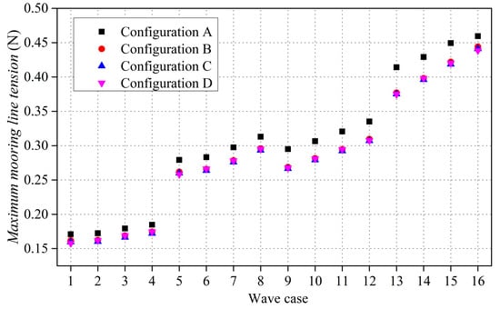 Maximum mooring line tension for Configurations A-D under waves and currents.