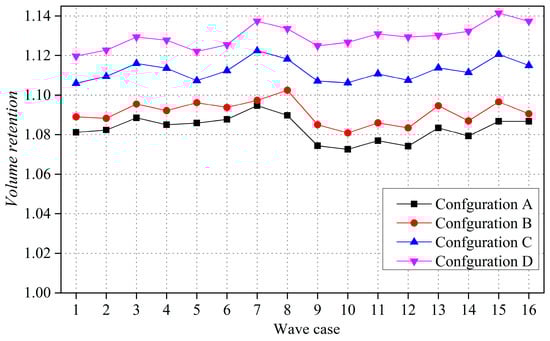 Volume retention is used to represent the change of floating rope enclosure volume under the action of current. Under the action of combined wave-current, the flexible structure endures serious deformation, which makes the volume of aquaculture water smaller and even scratches the fish. The aquaculture water area of floating is much larger than that of the net cage, the volume loss may be small relative to the total volume, so volume loss is not a big problem for a floating rope enclosure. However, due to the flexibility, the volume of floating rope enclosure increases with the action of combined wave current. The increase of volume indicates that the net deformation increases and a too large deformation may cause the net to tear, which endangers the safety of the whole structure. Therefore, for the floating rope enclosure, it is appropriate to keep the volume relatively stable. Variations in volume retention of different configurations are shown in Figure 16. Configuration A has the smallest volume retention, that is to say that it is also the most stable. The volume retention of Configurations B-D increases with the increase of the amount of mooring lines. This may be due to the fact that the floating rope enclosure is a pure flexible structure. The more mooring lines there are, the stronger the pulling force acting on it, which results in an increase of the increasing volume.