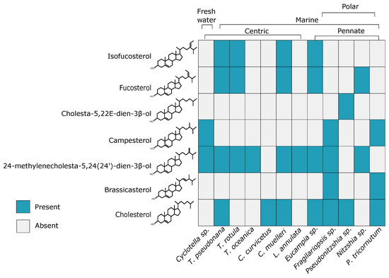 - Jaramillo-Madrid, A.C.; Ashworth, J.; Fabris, M.; Ralph, P.J. Phytosterol biosynthesis and production by diatoms (Bacillariophyceae). Phytochemistry 2019, 163, 46–57. [Google Scholar] [CrossRef]
