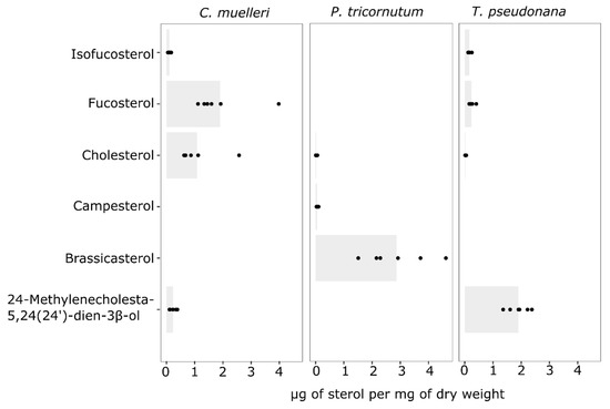 Sterol levels in diatoms growing at 4 °C. Abundance is given in terms of µg of sterol per mg of biomass dry weight (n = 3).