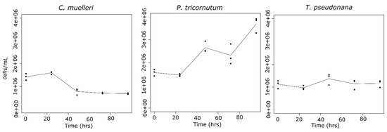 In response to a shift to cold temperature (4 °C), the diatoms C. muelleri, P. tricornutum and T. pseudonana exhibited different growth effects (Figure 3). The cell density of C. muelleri, which was isolated in 24 °C seas near Hawaii, decreased after 24 h at 4 °C. T. pseudonana, which was isolated from a temperate seasonal environment (10–20 °C), maintained cell density at 4 °C but did not multiply further. In contrast, P. tricornutum continued to grow at 4 °C, despite a reported optimal temperature range of 11–21 °C (Figure 3) [23].