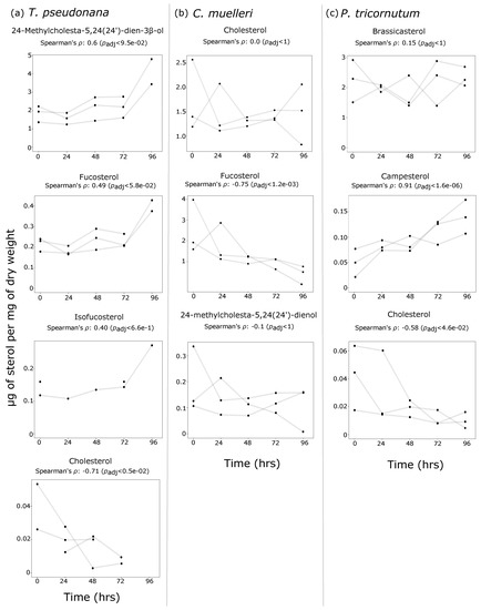 Changes in sterol content during the shift to lower temperature appeared to correlate with survival. In C. muelleri, sterol content did not change significantly, with the exception of a marginal decrease in fucosterol (Spearman’s ρ: −0.75, p < 0.0012; Figure 4, t-test, p = 0.015; Figure 5). In T. pseudonana, multiple sterols appeared to shift in relative abundance, but with insufficient replicates to provide confident conclusions. In P. tricornutum, campesterol increased (Spearman’s ρ: 0.91, p < 0.0000016, t-test, p = 0.03), while cholesterol decreased (Spearman’s ρ: −0.58, p < 0.0046, t-test, p = 0.037; Figure 4 and Figure 5).