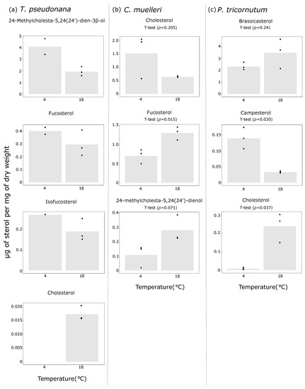 Further research is required to describe to what extent different temperatures affect sterols composition in diatoms, how this is regulated, and whether general trends can be reliably detected. It was reported that the sterol content in P. tricornutum at 13 °C increased by more than 50% compared to sterols produced at 23 °C [25], but an increase of this magnitude was not observed in our study. In contrast, Piepho et al. (2012) showed that the freshwater diatom Cyclotella meneghiniana produced lower amounts of sterols at 10 °C than at 25 °C, and that this also depended on the supply of phosphorus [18].