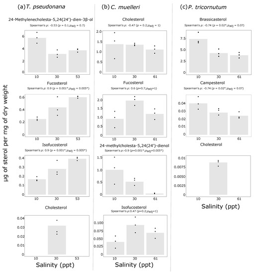 To measure the effect of salinity on the sterol content of diatoms, we grew C. muelleri and P. tricornutum in medium containing salt at concentrations of 10 ppt, 30 ppt and 61 ppt, and T. pseudonana in medium containing salt at concentrations of 10 ppt, 30 ppt and 53 ppt. The amount of the principal sterol found in C. muelleri, cholesterol, was not affected by changes in salinity. 24-Methylcholesta-5,24(24’)-dien-3β-ol decreased at 61 ppt (Spearman’s ρ: −0.9, p < 0.001; Figure 7). In T. pseudonana, levels of its principal sterol 24-methylcholesta-5,24(24’)-dien-3β-ol were not affected by changes in salinity, but fucosterol and isofucosterol increased in proportion to salinity concentration (Figure 7). At low salinity (10 ppt), fucosterol was reduced by 50% compared to standard salinity (30 ppt), and increased by 20% at high salinity (53 ppt; Spearman’s ρ: 0.9, p < 0.001). In P. tricornutum, brassicasterol and campesterol levels were negatively correlated with salinity concentration: at low salinity (10 ppt) both sterols increased relative to standard salinity (30 ppt) and decreased at high salinity (61 ppt; Spearman’s ρ: −0.74, p < 0.02). Traces of cholesterol were detected in T. pseudonana and P. tricornutum only under standard salinity conditions (30 ppt; Figure 7).