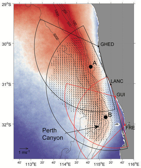 Two SeaSonde systems, located at Lancelin (LANC; 31°01.588′ S, 115°19.708′ E) and Green Head (GHED; 30°04.393′ S, 114°58.003′ E), were used to collect ocean currents at hourly intervals with ranges up to 200 km offshore with a spatial resolution of 6 km. Both stations operated at a central frequency of 4.463 MHz (measurement depth is approximately 2.5 m) with a 25 kHz bandwidth, 512-point fft, 1 Hz sweep rate, 20 min Doppler spectra averaging with 15-min output rate. Calibrated antenna patterns are used at both stations. Two WERA systems, located at Guilderton (GUI; 31°20.4960′ S, 115°29.3640′ E) and Port Beach, Fremantle (FRE; 32°.0198′ S, 115°44.7480′ E) provided hourly ocean surface currents at ranges up to 180 km offshore at 4 km spatial resolution. Both sites used 4-element transmit and receive arrays of 16 equally spaced elements. Systems operated at 9.335 MHz (sampling depth approximately 1.3 m) with 33.3 kHz bandwidth, 1024-point fft and 0.26 s sweep rate, and an integration time of 5 min. Radial velocity data were collected on a Cartesian grid with 4 km spacing every 10 min in alternate mode. The same Cartesian grid was used to compute hourly surface current vectors from the hourly-averaged radial data.