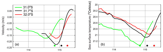 Mean cross-shelf profiles of HFR velocity at three different latitudes: at 31° S (green); 31.7° S (black); and, 32° S (red). Panel (a) refers to summer. Panel (b) refers to winter. The asterisks denote the locations of the 200 m depth contour. Units for the x-axis are °E.
