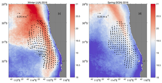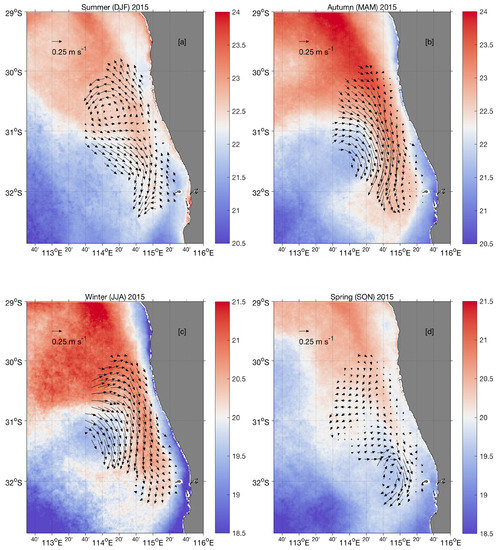 Autumn months indicated the strengthening of the LC between summer and winter (Figure 4b, Figure 5b and Figure 6b). The currents during 2015 autumn were stronger when compared to 2016 and 2017. The spring months represented weakening of the LC from winter to summer (Figure 4d, Figure 5d and Figure 6d) and the currents during 2017 spring were stronger when compared to 2015 and 2016. The autumn and spring patterns indicated the presence of anti-clockwise eddies over the Perth canyon (approximately 32° S) e.g., spring 2015 and autumn 2017. A large meander with the LC flowing in an ‘S’ shaped pattern was evident during spring 2017 (Figure 6d).