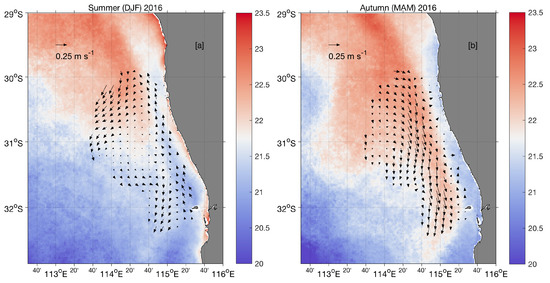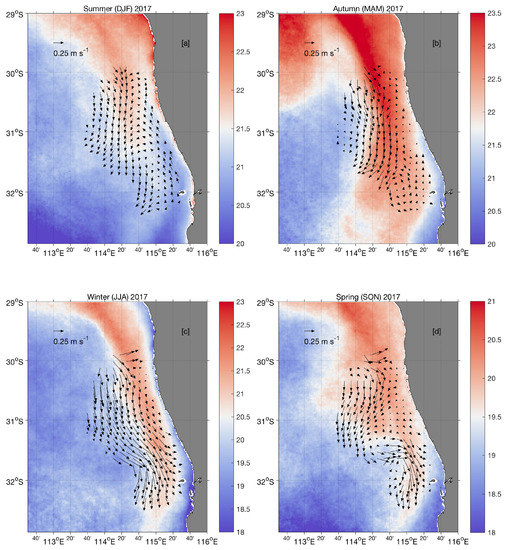 For the following analyses, the HFR and SST data were seasonally averaged for 2015, 2016 and 2017. Here, the seasons were defined as: austral summer: December, January, February (DJF); autumn: March, April, May (MAM); winter: June, July, August (JJA); spring: September, October, November (SON). The daily-, monthly-, and seasonally-, averaged, merged SeaSonde-WERA HFR currents were then used for detailed analysis.