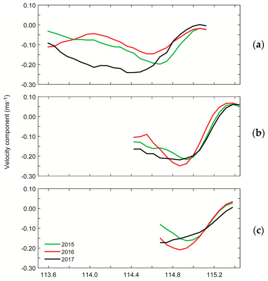 Mean cross-shelf profiles of HFR velocity for 2015, 2016 and 2017 at (a) 31° S; (b) 31.7° S; and, (c) 32° S. Units for the x-axis are °E.
