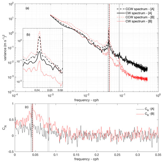 (a) Rotary power spectra of hourly surface currents at locations A (Seasonde) and B (WERA) (Figure 2) within the HFR domain showing the dominant spectral features in the region. Vertical lines identify the semidiurnal and diurnal frequency bands (thin grey lines), respectively; and, the inertial frequency at the two locations. (b) Same as (a), but for the diurnal frequency band. (c) Rotary coefficients (CR) spectra derived from for (a). Units are m2s−2cph−1 and cycles per hour (cph) for rotary spectra and frequency axis; CR is dimensionless.