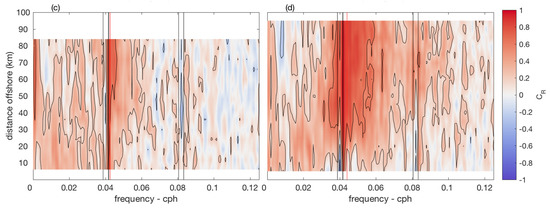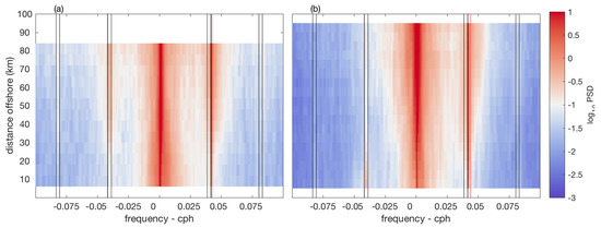 Variance levels of the currents increased both southwards and offshore, particularly within the low- and diurnal- frequency bands, with a distinct discontinuity around 30-40 km from the coast, approximately at the location of the 200 m depth contour (e.g., shelf break, Figure 2), indicating spatial distribution of near-inertial and diurnal variance and the low-frequency band (Figure 11). Here, the near inertial to diurnal band spans [0.038, 0.046] cph, corresponded to periods in the range [21 h 44 m 20.8 s, 26 h 18 m 56.8 s]. The study region experiences strong diurnal–inertial resonance due to strong diurnal sea breezes and the critical latitude that generate near-inertial waves that extend to depths >200 m [4]. Higher variance in deeper water (Figure 11a), therefore, reflect that the diurnal–inertial resonance being more effective in deeper water (see also [4]). The low-frequency band was defined as frequencies below 0.0088 cph (periods longer than 4 days) and the distribution of variance indicated a band of higher values between the 200 m and 3000 m depth contours and is representative of the LC variability (Figure 11b).